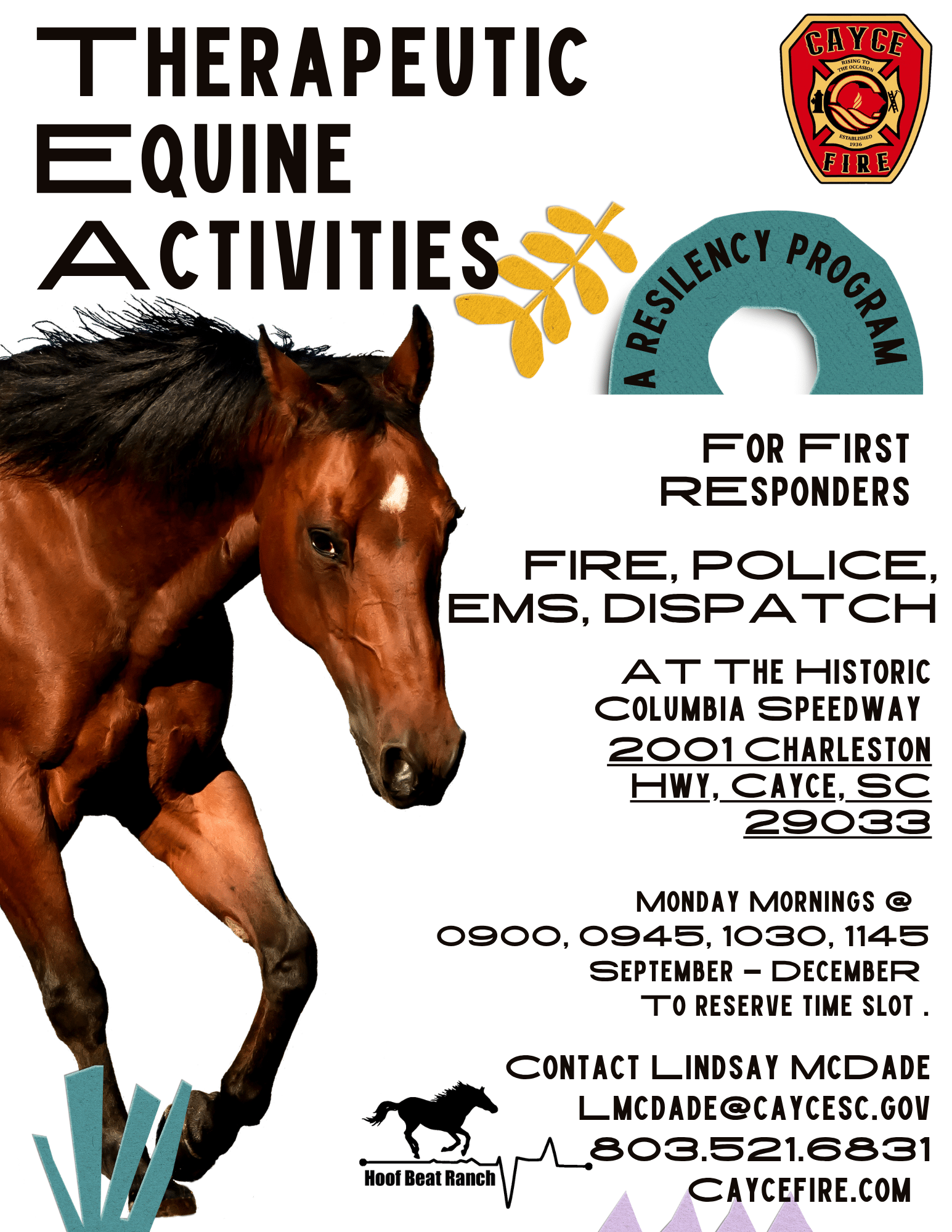 The Therapeutic Equine Activities (TEA) program is being offered this Fall at no cost to first responders at the Historic Columbia Speedway.